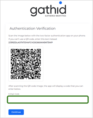 - Enter the 6-digit number from your Authenticator app onto the Authentication Verification screen for the Gathid upload portal.
